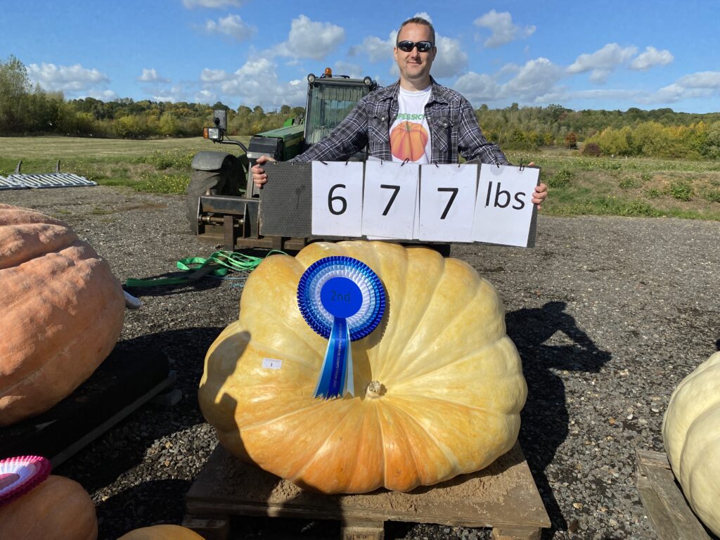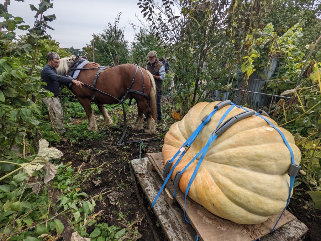 Some will know that in 2022 I achieved a personal best with a giant pumpkin weighing 677lbs, using a seed I’d cross bred during the 2020 lockdown period. Part American monster (weighing over 1800 lbs over there) pollinated with a Peskett allotment inbred of a few generations (never exceeding more than 500lbs). The combination of genes worked and I had a fabulous time driving that 677lbs beast around the M25 in a truck to RHS Hyde Hall after lifting it with the help of Daniel Brown the Dorking horseman and Hugh Broom the local farmer.