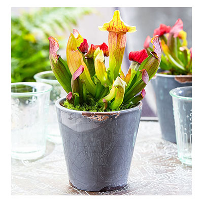 Carnivorous Pitcher Plant ‘Maroon’ – Plant (£8.95) – This is an exceptional plant that will digest flies and other small insects that are attracted to the plant by the secretions on the lip of the trumpet shaped pitchers. Supplied in a nursery pot size Ø 8.5 cm