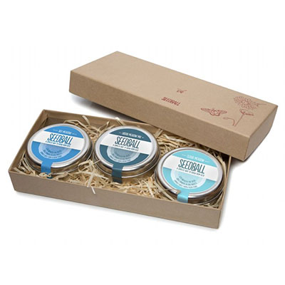Seedball Gift Box – Pick n’ mix your perfect gift selection (£18.99) – Bee mix, butterfly mix, urban meadow mix – choose three tins of throw and grow seed balls.