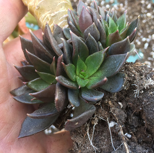 As well as potting up the new succulents I took the opportunity to propagate one of my oldest indoor plants – an Echeveria Black Prince. These succulents tend to get a bit tall and leggy after a year or too, toppling over to one side which can cause a pot to become unsteady. Thankfully they propagate very easily with smaller Echeveria offspring growing at the base of the stem. These baby Echeveria are easily prised away from the main stem and because they come with their own roots they are easily placed into a pot immediately. I took a few and placed them beside some of my newer Lidl succulents and then discarded the original ugly Echeveria. Other succulents will often propagate from a healthy leaf if simply removed from a stem and left to lay on top of some soil for few weeks, eventually roots appear and the new plant can be potted up.